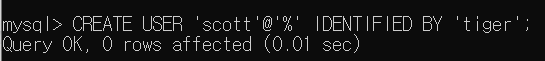 CREATE USER 'scott'@'%' IDENTIFIED BY 'tiger';