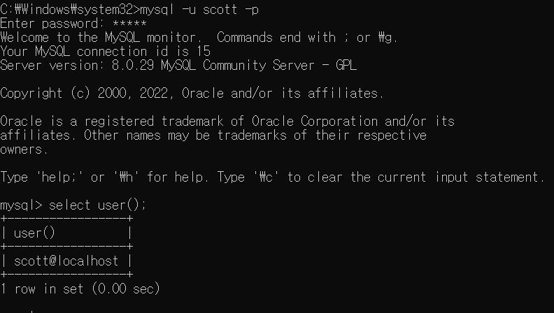 exit으로 빠져나오고 방금 생성한 scott 계정으로 로그인하기