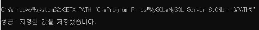 SETX PATH “C:\Program Files\MySQL\MySQL Server 8.0\bin;%PATH%”