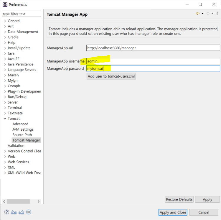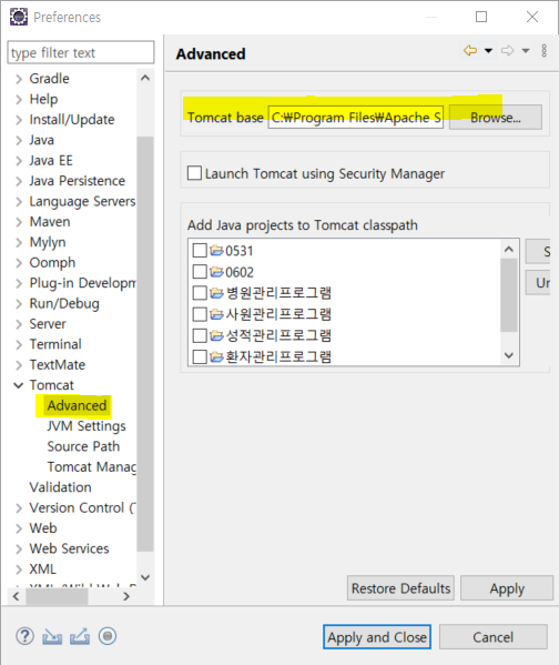 그리고 advanced가서 tomcat base 설정해주기
