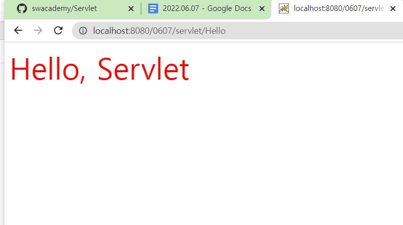 저기 경로에 /0607누르고 url-pattern에 써준 것처럼 /servlet/Hello 써주고 검색하면!