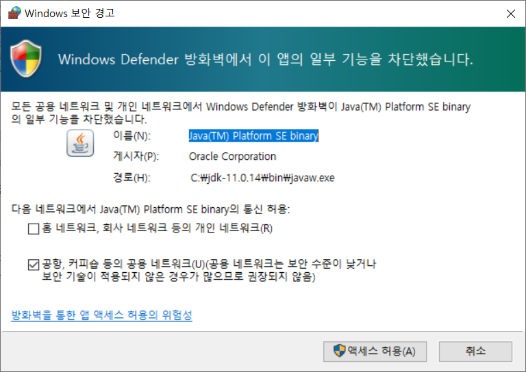 그럼 방화벽 해제하라고 뜬다!