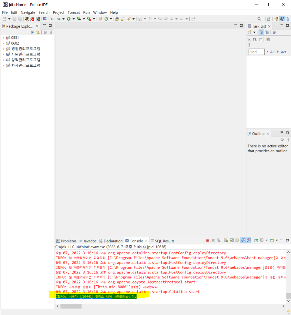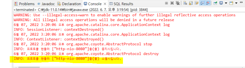 만약 8080이 이미 사용중이라고 뜨면 작업관리자 창에 가서 세부사항에 javaw.exe를 종료시킨다.